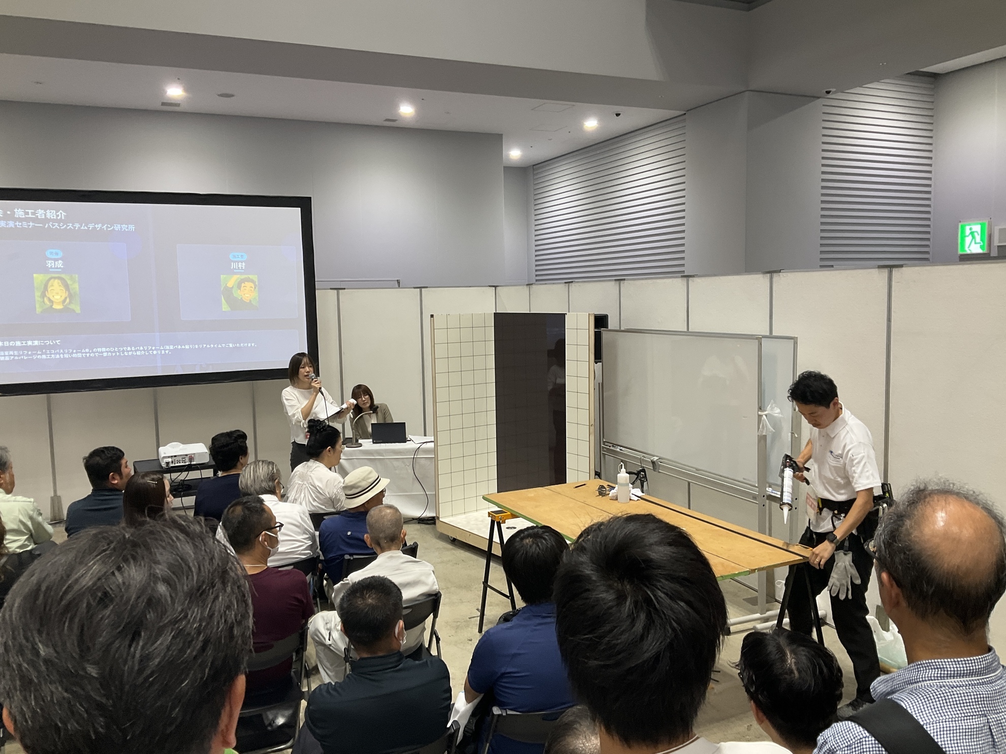 画像は、既存タイルに断熱性能を持ったバスパネルの施工実演。