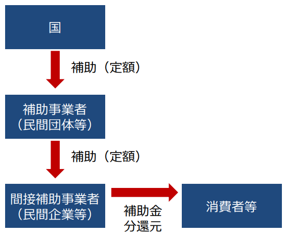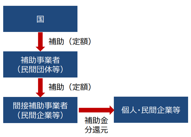 ※ 申請手続は、個人・民間企業等と契約の締結等を行った間接補 助事業者(民間企業等)が行い、補助金の交付を受け、交付 された補助金を個人・民間企業等に還元する。